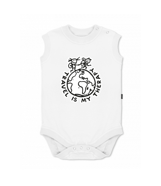 Baby body sleeveless with design for kid with design 1240 TRAVEL IS MY THERAPY in color WHITE