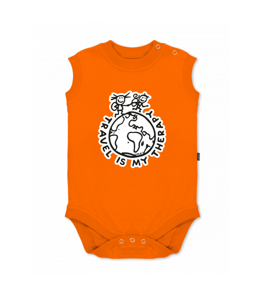 Baby body sleeveless with design for kid with design 1240 TRAVEL IS MY THERAPY in color SIGNAL ORANGE