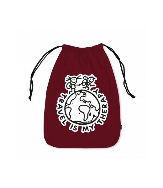 Medium cotton pouch for kid with design 1240 TRAVEL IS MY THERAPY in color DARK RED