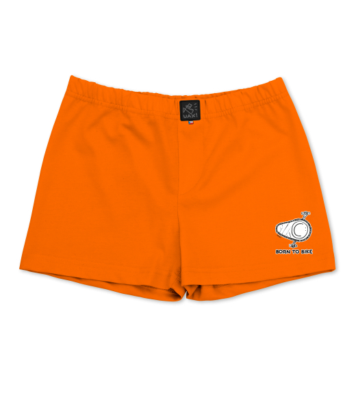 We make sustainable UAX clothing! - hand sewn in the Czech Republic uaxKids uaxSki collectionTrunksBOYS SHORTSdesign 1074 - BORN TO BIKESIGNAL ORANGE