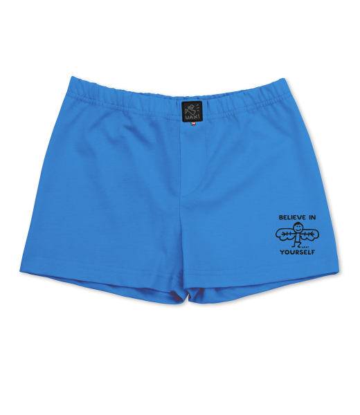 We make sustainable UAX clothing! - hand sewn in the Czech Republic uaxKids uaxSki collectionTrunksBOYS SHORTSdesign 1228 - BELIEVE IN YOURSELFCAPRI BLUE
