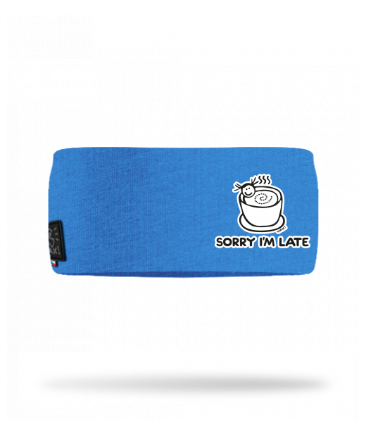 Cotton sports headband for man with design 1087 SORRY IM LATE in color CAPRI BLUE