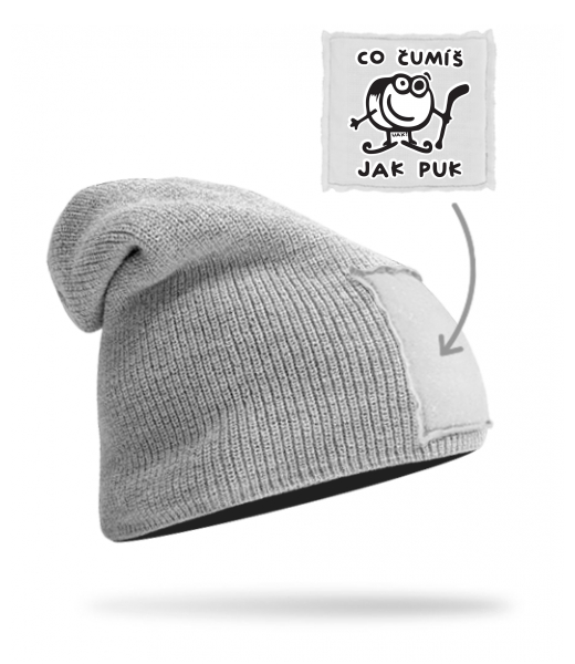 Quality knitted hat BEANIE unisex for man with design 1101 ČUMÍŠ JAK PUK in color GREY/WHITE
