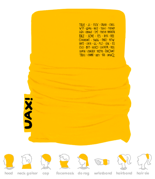 Multifunctional cotton scarf with UAX print! Made of 100% cotton, on the front of the print selection. Choice of many colors. Wrist bandages are stitched and silk-screen printed in the Czech Republic!
