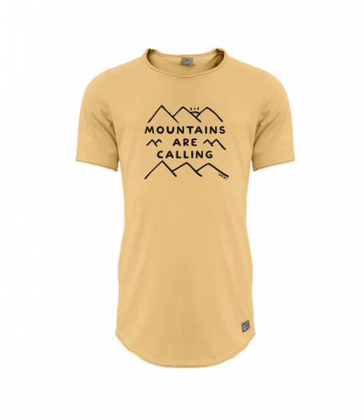 Mens T-shirt PARKOUR LONG for man with design 1204 MOUNTAINS ARE CALLING in color MUSTARD