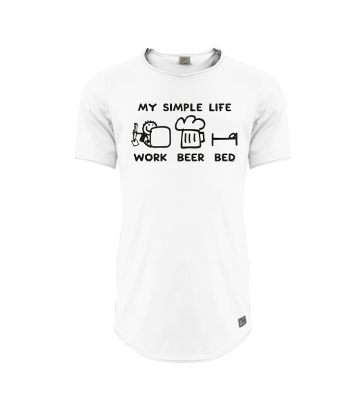 Mens T-shirt PARKOUR LONG for man with design 1211 MY SIMPLE LIFE WORK BEER BED in color WHITE