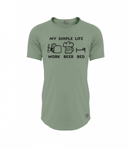 Mens T-shirt PARKOUR LONG for man with design 1211 MY SIMPLE LIFE WORK BEER BED in color OLIVA