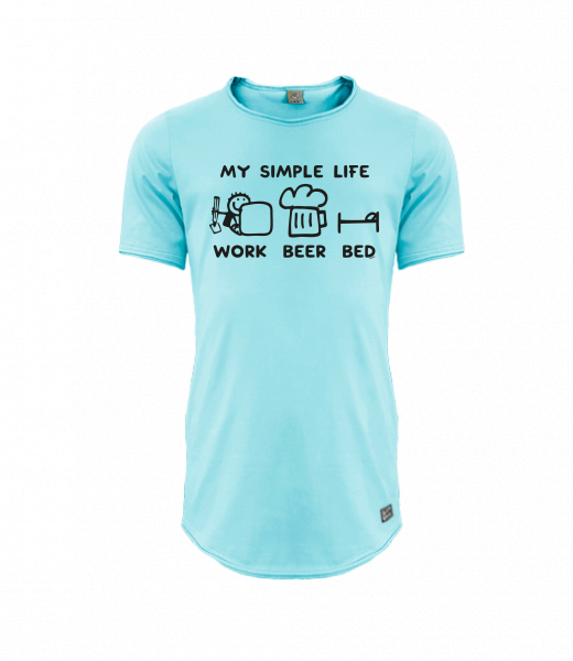 Mens T-shirt PARKOUR LONG for man with design 1211 MY SIMPLE LIFE WORK BEER BED in color PASTEL BLUE