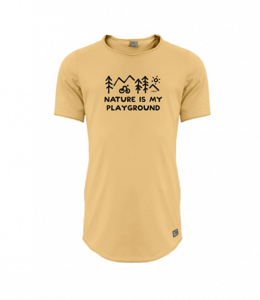 Mens T-shirt PARKOUR LONG for man with design 1223 NATURE IS MY PLAYGROUND in color MUSTARD