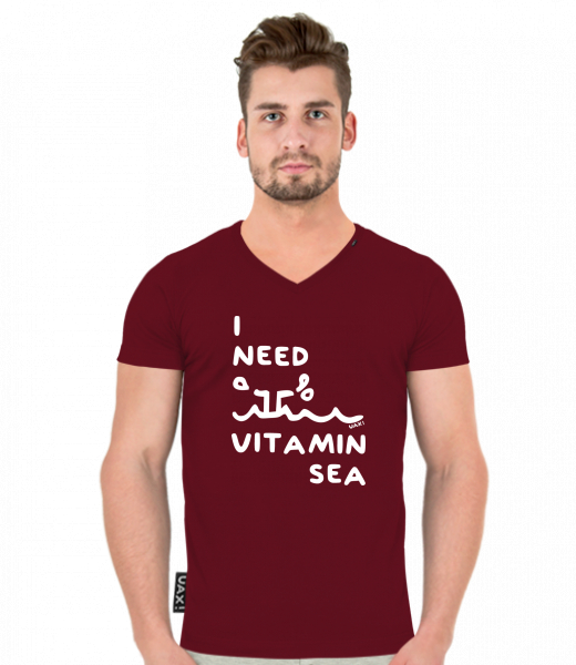 Men's T-shirt SLIM FIT with V nec for man with design 1132 I NEED VITAMIN SEA in color DARK RED