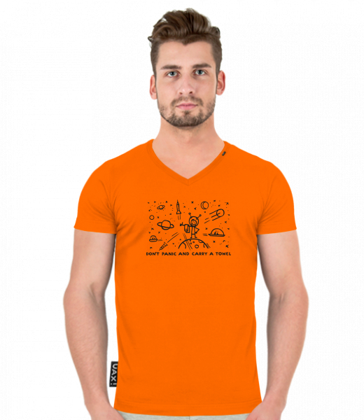 We make sustainable UAX clothing! - hand sewn in the Czech Republic uaxMen uaxAll productsT-shirtsT-SHIRTS SLIM FIT V NECKdesign 1156 - DON'T PANIC GALAXYSIGNAL ORANGE