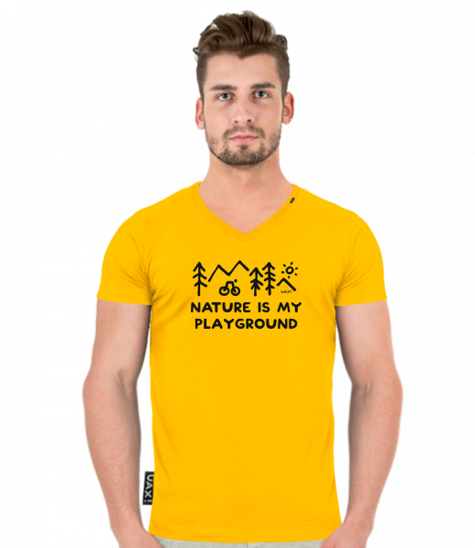 Men's T-shirt SLIM FIT with V nec for man with design 1223 NATURE IS MY PLAYGROUND in color GOLDEN CREAM