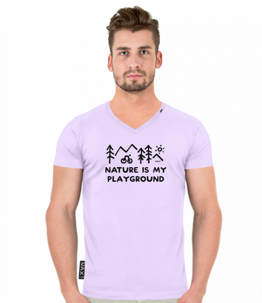 Men's T-shirt SLIM FIT with V nec for man with design 1223 NATURE IS MY PLAYGROUND in color LAVENDER