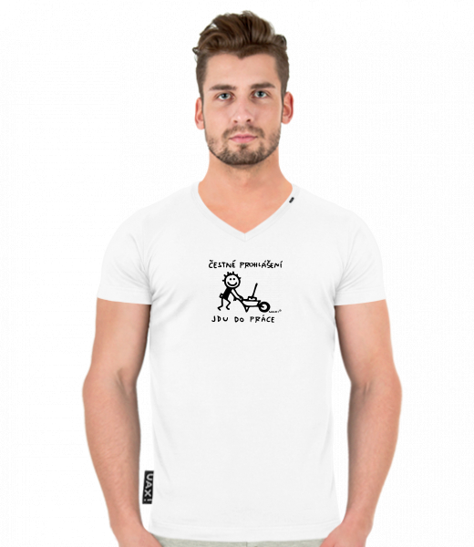 Men's T-shirt SLIM FIT with V nec for man with design 1305 ČESTNÉ PROHLÁŠENÍ JDU DO PRÁCE 2 in color WHITE