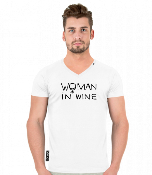 Men's T-shirt SLIM FIT with V nec for man with design 1346 WOMAN IN WINE 1 in color WHITE