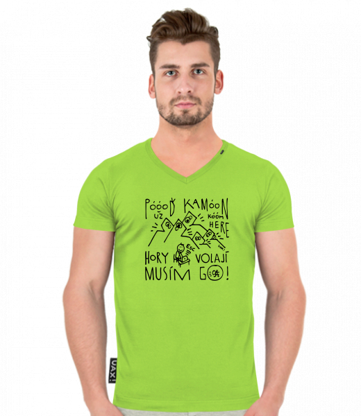 We make sustainable UAX clothing! - hand sewn in the Czech Republic uaxMen uaxAll productsT-shirtsT-SHIRTS SLIM FIT V NECKdesign 1368 - POOOĎ KAMOON HORY MUSÍM JÍT GOPARROT GREEN