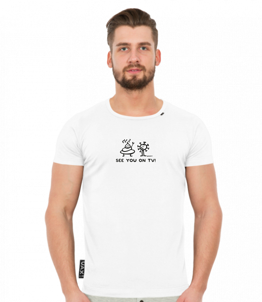 We make sustainable UAX clothing! - hand sewn in the Czech Republic uaxMen uaxAll productsT-shirtsT-SHIRTS SLIM FITdesign 1306 - SEE YOU ON TVWHITE