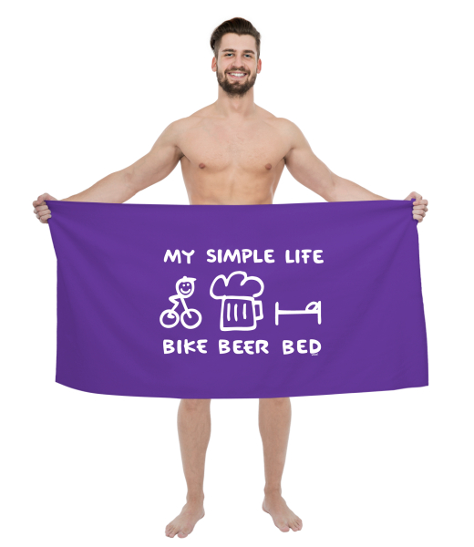 The original towel imprinted with UAX! Cycling for man with design 1056 BIKE BEER BED in color VIOLET