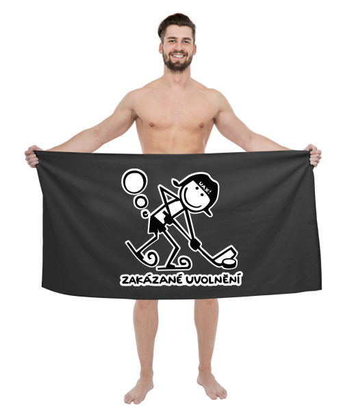 The original towel imprinted with UAX! Cycling for man with design 1059 ZAKÁZANÉ UVOLNĚNÍ in color BLACK