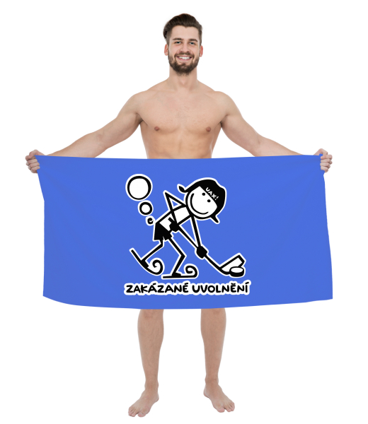 The original towel imprinted with UAX! Cycling for man with design 1059 ZAKÁZANÉ UVOLNĚNÍ in color CAPRI BLUE