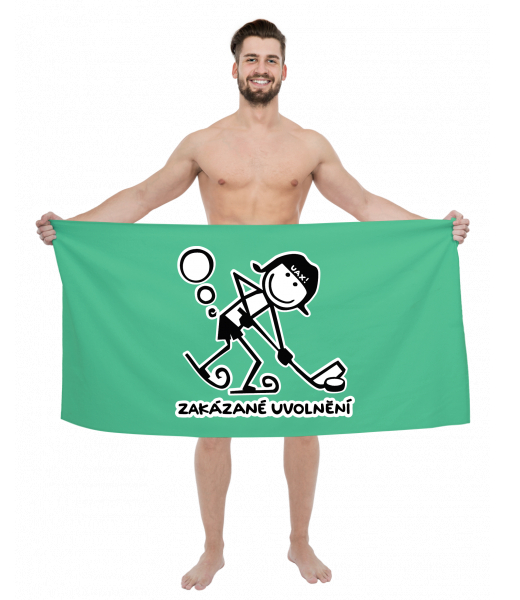 The original towel imprinted with UAX! Cycling for man with design 1059 ZAKÁZANÉ UVOLNĚNÍ in color EUCALYPTO GREEN