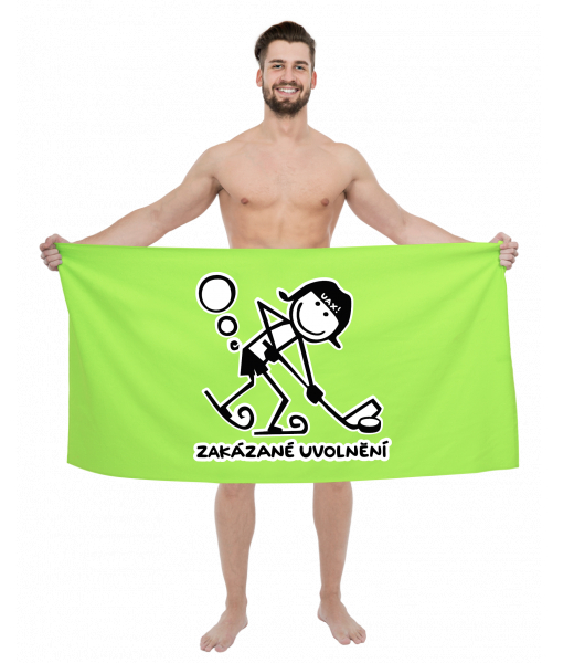 The original towel imprinted with UAX! Cycling for man with design 1059 ZAKÁZANÉ UVOLNĚNÍ in color FLUO GREEN