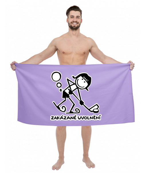 The original towel imprinted with UAX! Cycling for man with design 1059 ZAKÁZANÉ UVOLNĚNÍ in color LAVENDER