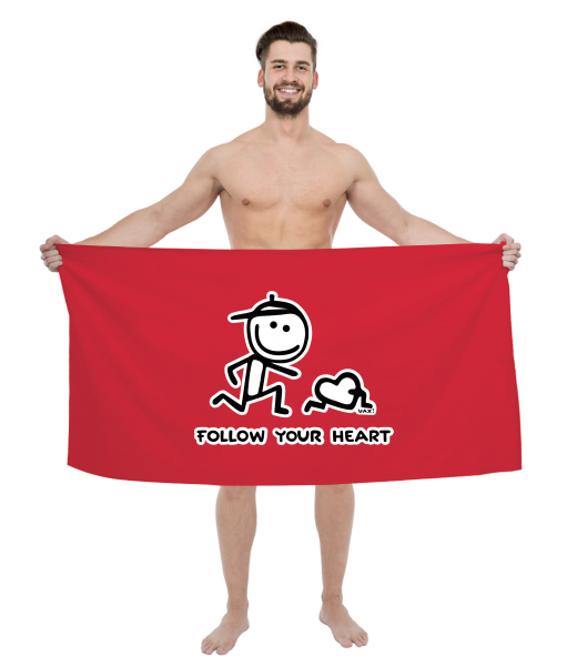 The original towel imprinted with UAX! Cycling for man with design 1063 FOLOW YOUR HEART in color RED