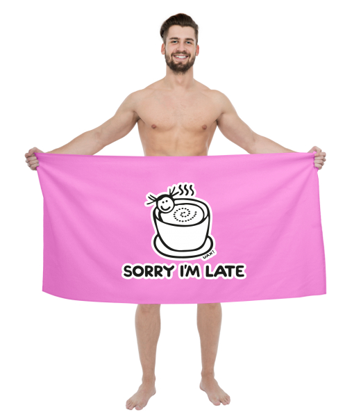 The original towel imprinted with UAX! Cycling for man with design 1087 SORRY IM LATE in color INDIAN LILA