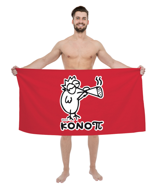 The original towel imprinted with UAX! Cycling for man with design 1094 KONOPI in color RED