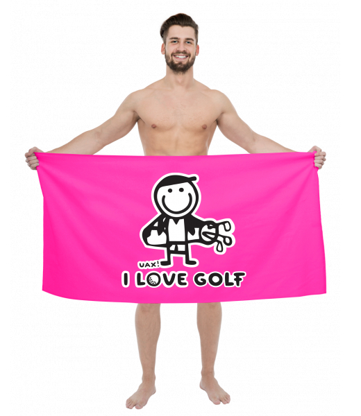 The original towel imprinted with UAX! Cycling for man with design 1107 I LOVE GOLF in color FLUO PINK