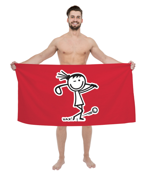 The original towel imprinted with UAX! Cycling for man with design 1108 GOLF GIRL in color RED