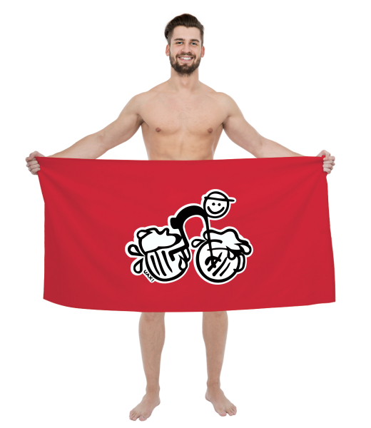 The original towel imprinted with UAX! Cycling for man with design 1110 BEER TOUR in color RED