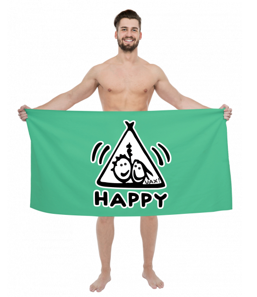 The original towel imprinted with UAX! Cycling for man with design 1113 HAPPY in color EUCALYPTO GREEN