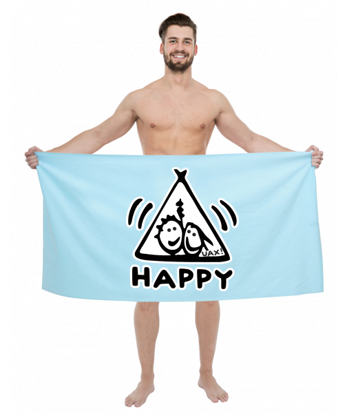 The original towel imprinted with UAX! Cycling for man with design 1113 HAPPY in color PASTEL BLUE