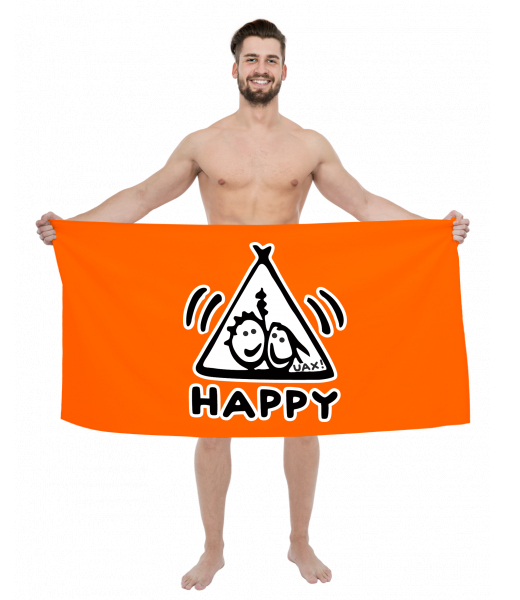 The original towel imprinted with UAX! Cycling for man with design 1113 HAPPY in color SIGNAL ORANGE