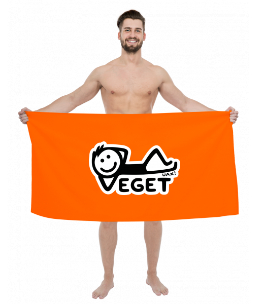 The original towel imprinted with UAX! Cycling for man with design 468 VEGET in color SIGNAL ORANGE