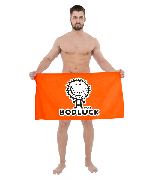 The original towel imprinted with UAX! Cycling for man with design 1002 BODLUCK in color SIGNAL ORANGE