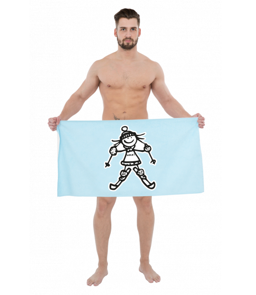 The original towel imprinted with UAX! Cycling for man with design 1179 SKIER GIRL in color PASTEL BLUE