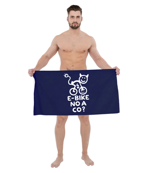 The original towel imprinted with UAX! Cycling for man with design 1291 E-BIKE NO A CO? in color MIDNIGHT BLUE