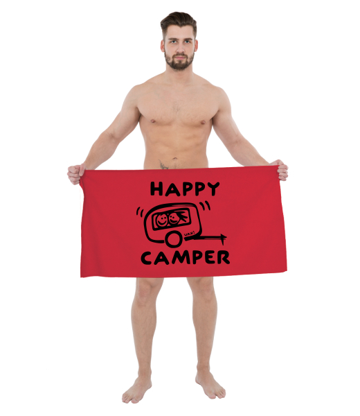 The original towel imprinted with UAX! Golf collection for man with design 1116 HAPPY CAMPER in color RED
