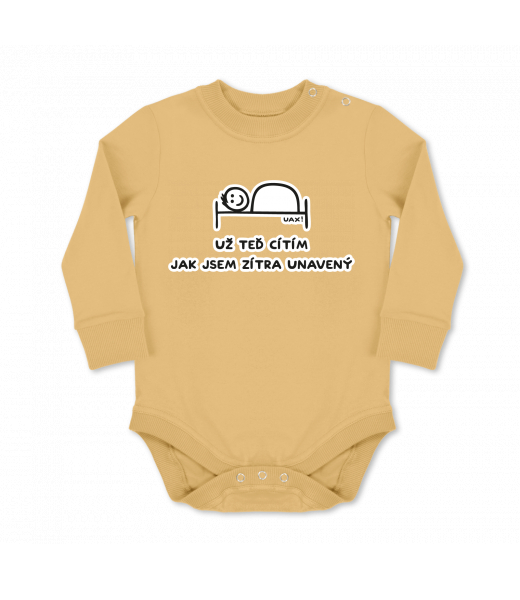 UAX baby body Ski collection for man with design 1200 UŽ TEĎ CÍTÍM JAK JSEM ZÍTRA UNAVENÝ in color MUSTARD