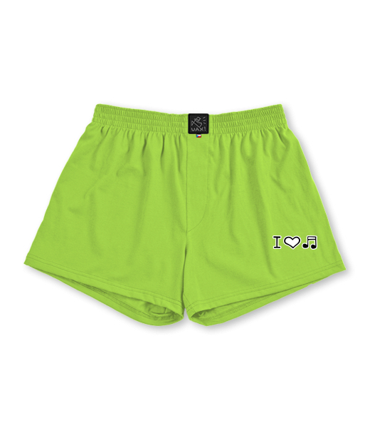 We make sustainable UAX clothing! - hand sewn in the Czech Republic uaxMen uaxSki collectionTrunksBOXERSdesign 1067 - I LOVE MUSICPARROT GREEN
