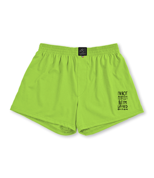 We make sustainable UAX clothing! - hand sewn in the Czech Republic uaxMen uaxSki collectionTrunksBOXERSdesign 1289 - IM NOT PERFECTPARROT GREEN