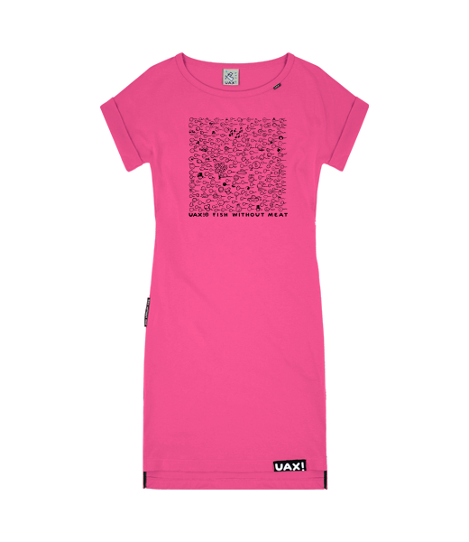 If you're looking for a comfortable women's dress that fits every figure, you've come to the right place. BASIC dresses are picked out to the smallest detail. They have a straight looser cut also in the upper part, so you don't have to worry about sweating in them in the summer. A soft cotton trim is sewn around the neck, decorated with a small woven UAX label. The Folded sleeves on the dress are also looser in the armpits. The dress has deep pockets sewn on both sides, which can reliably fit small items or a larger smartphone. The back part of the dress is extended, the front part is shorter. The dress has slits on the sides and a printed UAX cotton label sewn on the front. Any print can be printed on the dress. Please refer to the size charts when estimating sizes. We sew these CUSTOM dresses only after the order is created, just in time, tailored to you. Choose from 34 color combinations and more than 400 prints.