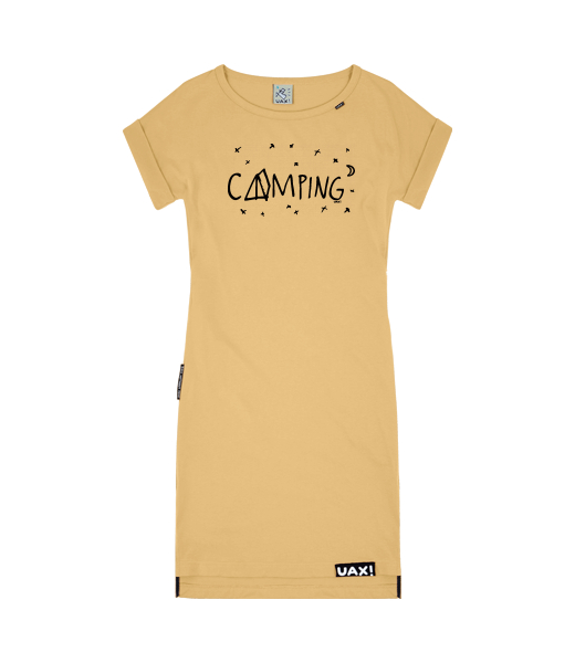 Women's dress BASIC with prints for woman with design 1112 CAMPING in color MUSTARD