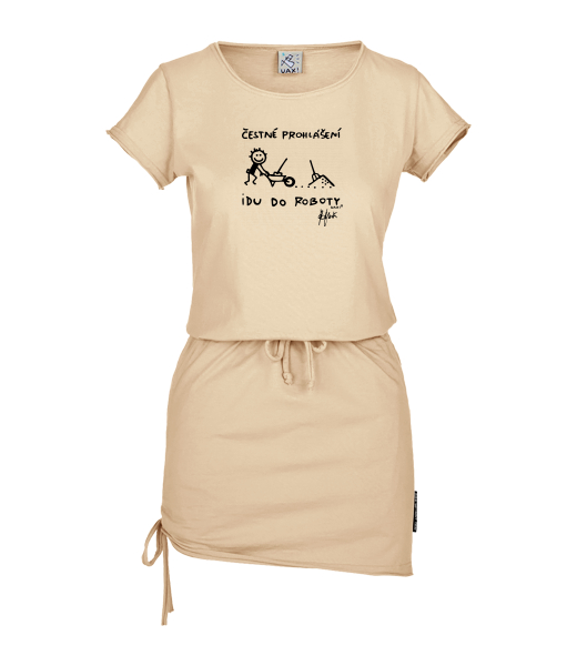 Women's dress URBAN with original prints for woman with design 1303 ČESTNÉ PROHLÁŠENÍ IDU DO ROBOTY in color CARAMEL