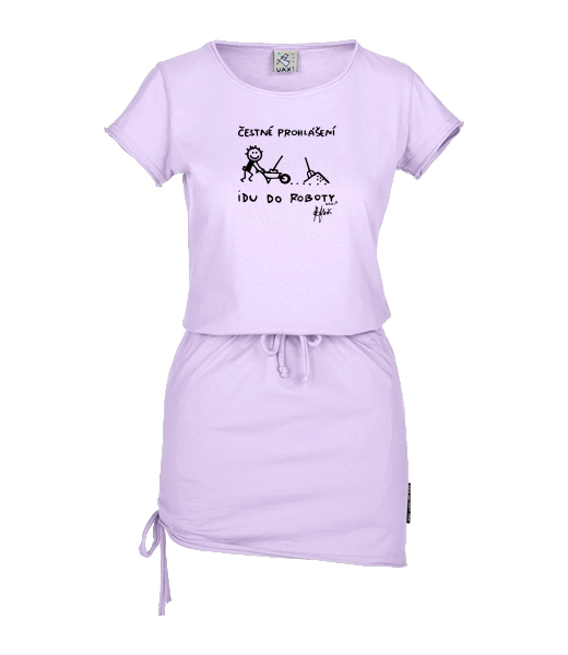 Women's dress URBAN with original prints for woman with design 1303 ČESTNÉ PROHLÁŠENÍ IDU DO ROBOTY in color LAVENDER