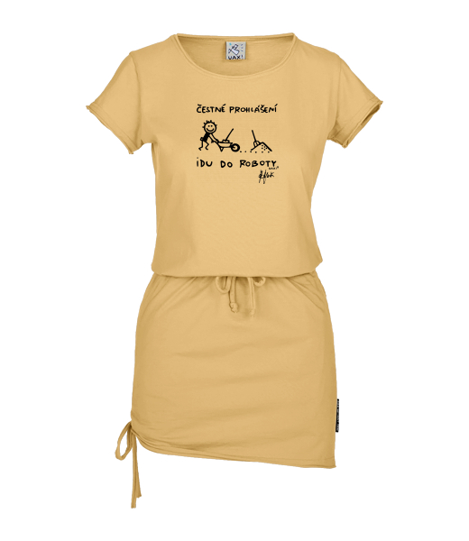 Women's dress URBAN with original prints for woman with design 1303 ČESTNÉ PROHLÁŠENÍ IDU DO ROBOTY in color MUSTARD