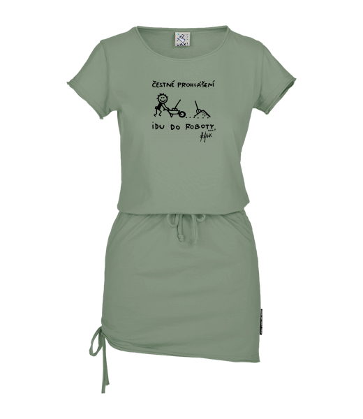 Women's dress URBAN with original prints for woman with design 1303 ČESTNÉ PROHLÁŠENÍ IDU DO ROBOTY in color OLIVA